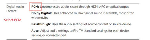 - Step 3,Turn on the TV, go to TV setting via your TV remote→select "Display and Sound"→ select "Sound Setting"→select "TV Speakers (on/off) "→ select "OFF", save settings, back to "Display and Sound"→ select "Digital Audio Format"→ select "PCM", save the setting, back to TV home screen